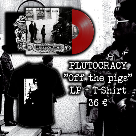 Formed in 1988 in Redwood City, California, Plutocracy are hands down one of the most iconic and unique names in West Coast powerviolence. Multi-vocals, angular riffing, neck-breaking tempo changes, rap inserts, noise grafts. All perfectly stitched together on a top tier grinding PowerViolence backbone. Recorded in 2010 and originally released in a scarcely circulated pressing very sought after by collectors, “Off the Pigs” is the last studio effort from this legendary unit, a bloodcurdling scream of street life, anti-authoritarian mindset and unrest mentality. Plutocracy defy the strictest definitions, a one-of-a-kind band that is impossible to pigeonhole, standing in the same category as Spazz, Crom, Agents Of Satan and No Le$$. This new edition of “Off the Pigs” is accompanied by a very limited t-shirt.